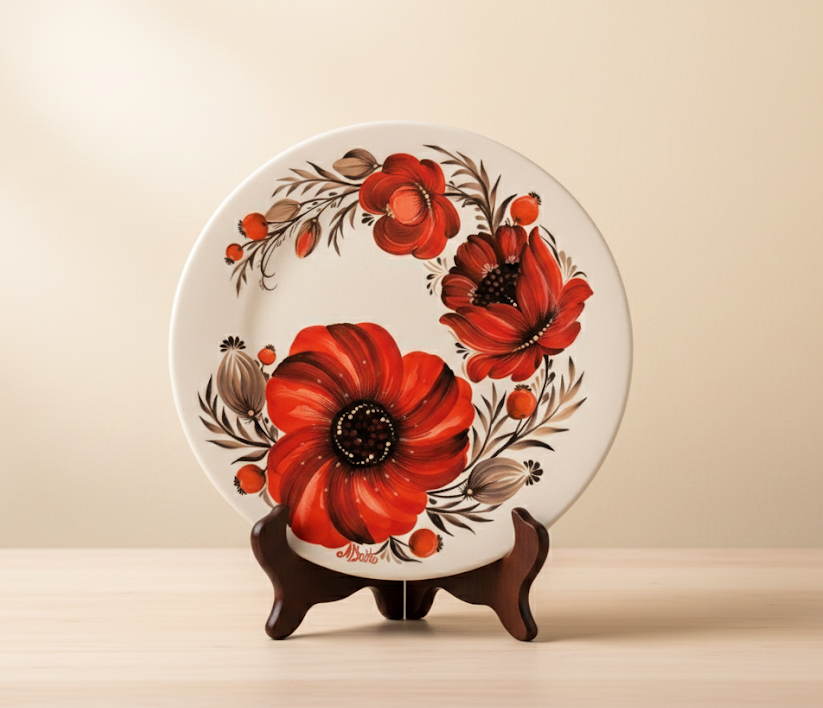 This decorative ceramic plate is part of the “Flowers of the Heart” collection, inspired by the deep symbolism of the poppy in Ukrainian culture. In Petrykivka painting, the red poppy represents beauty, youth, and the powerful energy of the earth. The circular composition symbolizes life’s harmony and eternity. Painted with professional materials and finished with a protective glaze, this unique piece serves as a sophisticated cultural accent, bridging ancient folk traditions with modern interior design.